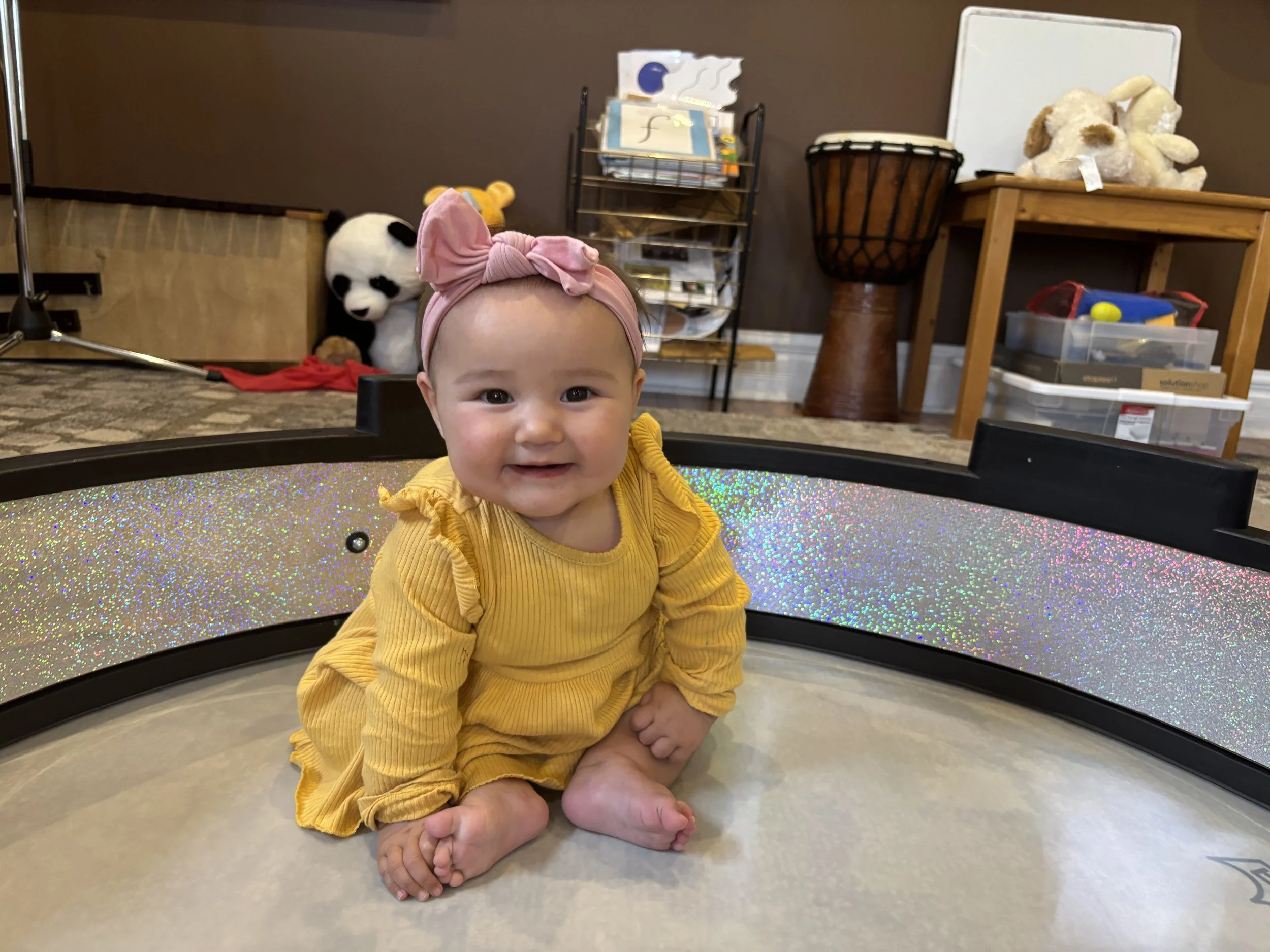 • A smiling baby girl with a yellow bow headband, lying on her stomach on a table, reaching toward the camera, with a plastic bag of toy musical instruments next to her.